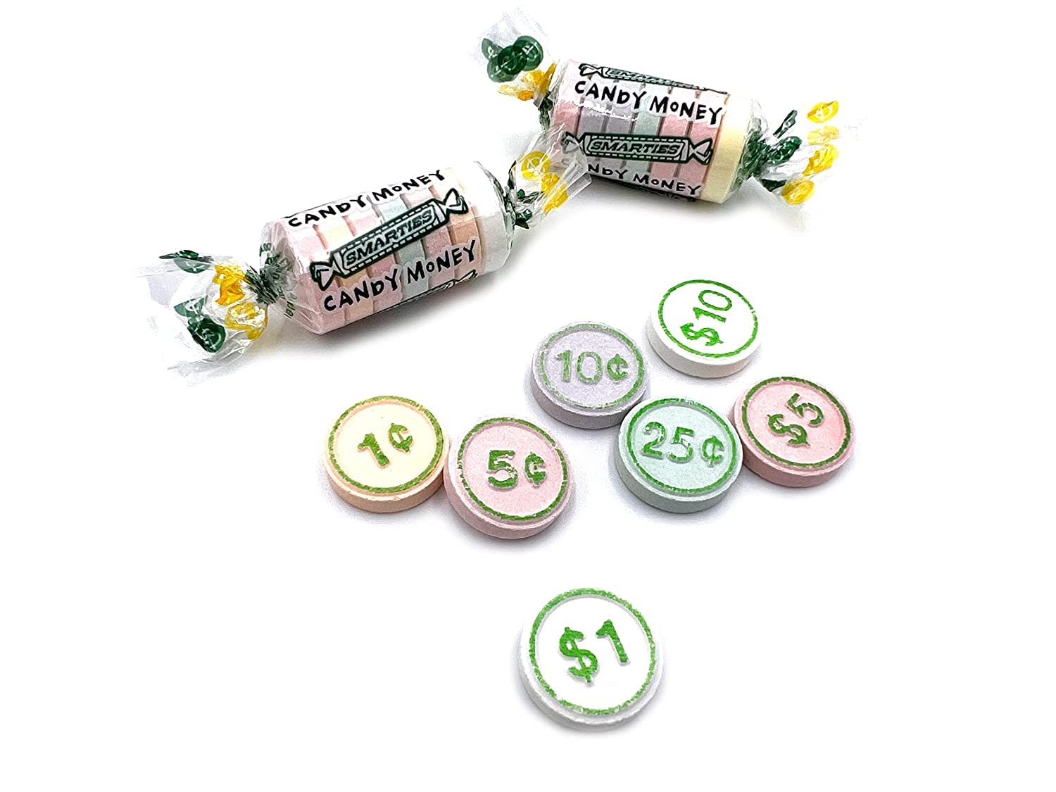 Smarties Candy Money are the same size as the Giant Smarties and feature green embossed ?dollars and cents? on their face. Each candy roll is packed with the original assorted Smarties flavors: Grape, Orange, Fruit Punch, Lemon, Lime, and Pineapple. These large coin shaped Smarties are individually wrapped in a clear Smarties wrapping, with embossed green dollars and cents on each candy. Offer them in a candy buffet, at a birthday party, or keep them for yourself. This candy does not contain gluten or the top common allergens. There are seven smarties per roll. Denominations include 1 cent to $25.00. These pastel colored sweetarts, are the size of a thick penny in individual rolls. These Smarties are packaged in bulk. Approximately 41 rolls per pound.